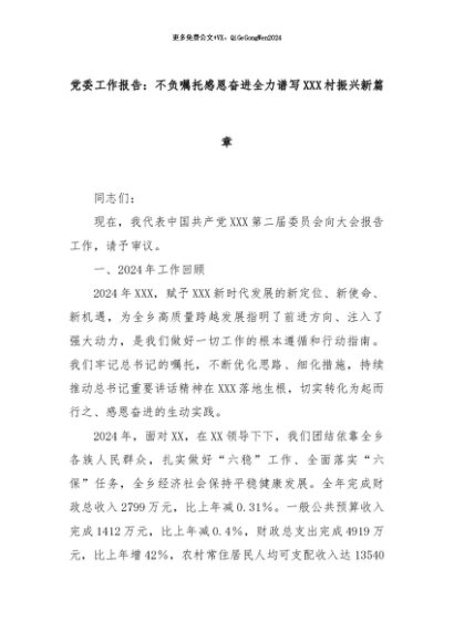 【七哥公文】2024年:党委工作报告:不负嘱托感恩奋进全力谱写XXX村振兴新篇章+更多免费公文+VX:QiGeGongWen2024