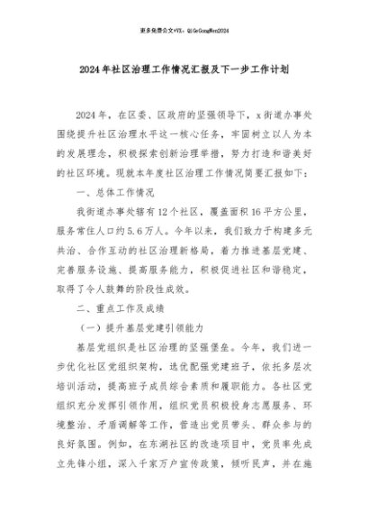 / 【七哥公文】2024年:2024年社区治理工作情况汇报及下一步工作计划+更多免费公文+VX:QiGeGongWen2024