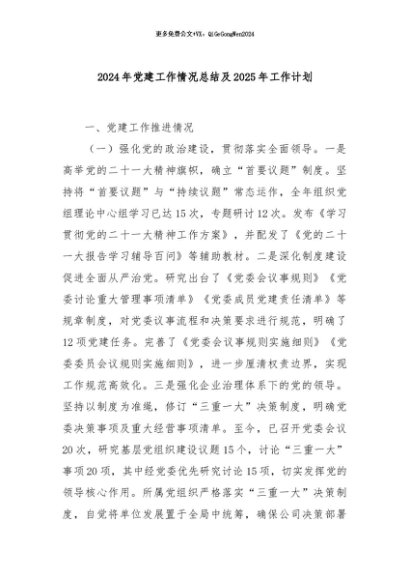/ 【七哥公文】2024年:2024年党建工作情况总结及2025年工作计划+更多免费公文+VX:QiGeGongWen2024