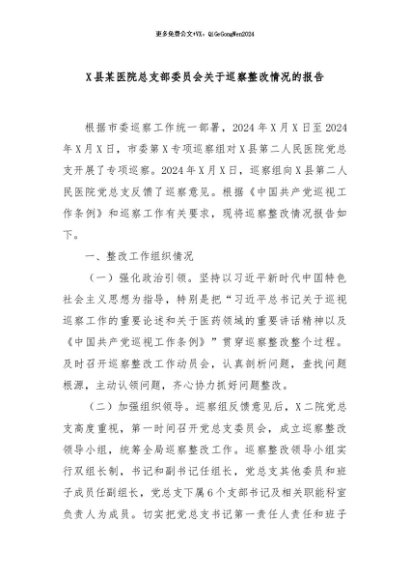/ 【七哥公文】2024年:X县某医院总支部委员会关于巡察整改情况的报告+更多免费公文+VX:QiGeGongWen2024