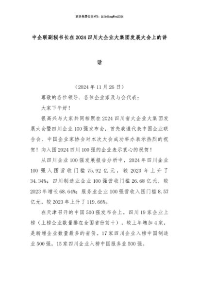 【七哥公文】2024年:中企联副秘书长在2024四川大企业大集团发展大会上的讲话+更多免费公文+VX:QiGeGongWen2024