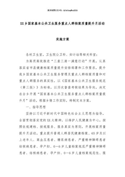 【七哥公文】2024年:XX乡国家基本公共卫生服务重点人群档案质量提升月活动实施方案+更多免费公文+VX:QiGeGongWen2024