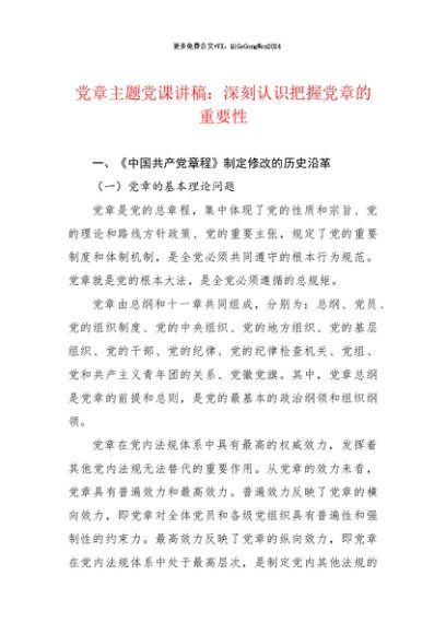 【七哥公文】2024年:12月党课讲稿:党章主题党课:深刻认识把握党章的重要性+更多免费公文+VX:QiGeGongWen2024