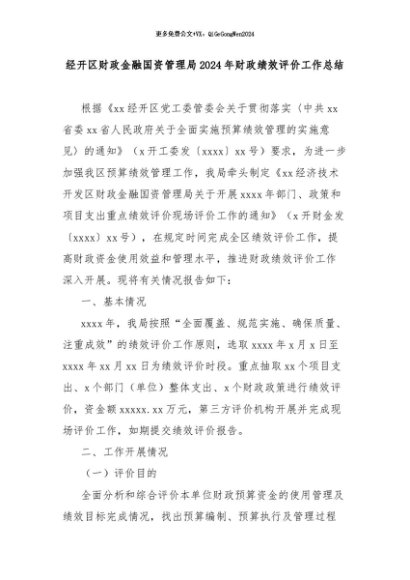 【七哥公文】2024年:经开区财政金融国资管理局2024年财政绩效评价工作总结+更多免费公文+VX:QiGeGongWen2024