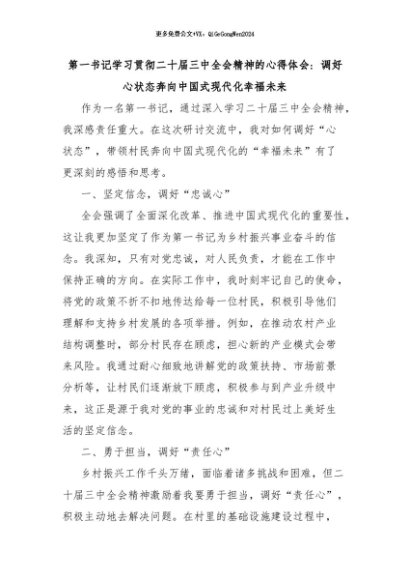 【七哥公文】2024年:第一书记学习贯彻二十届三中全会精神的心得体会:调好心状态奔向中国式现代化幸福未来+更多免费公文+VX:QiGeGongWen2024