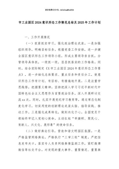 【七哥公文】2024年:市工业园区2024意识形态工作情况总结及2025年工作计划+更多免费公文+VX:QiGeGongWen2024