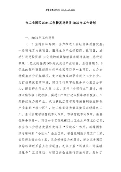 【七哥公文】2024年:市工业园区2024工作情况总结及2025年工作计划+更多免费公文+VX:QiGeGongWen2024