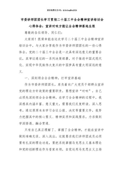 【七哥公文】2024年:市委讲师团团长学习贯彻二十届三中全会精神宣讲培训会心得体会:宣讲对味方能让全会精神落地生根+更多免费公文+VX:QiGeGongWen2024