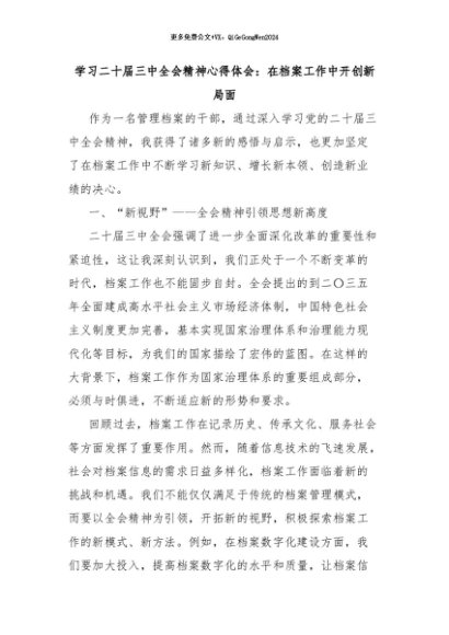 【七哥公文】2024年:学习二十届三中全会精神心得体会:在档案工作中开创新局面+更多免费公文+VX:QiGeGongWen2024