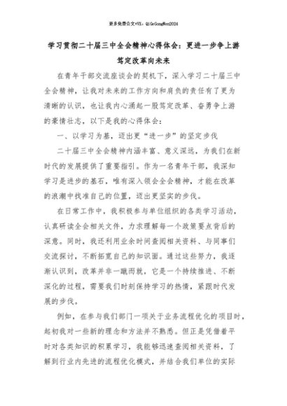 【七哥公文】2024年:学习贯彻二十届三中全会精神心得体会:更进一步争上游笃定改革向未来+更多免费公文+VX:QiGeGongWen2024