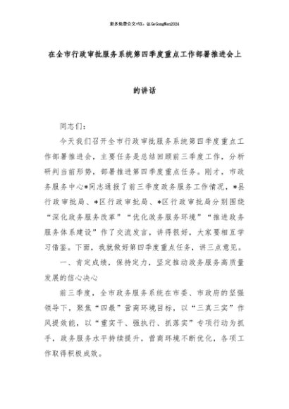 【七哥公文】2024年:在全市行政审批服务系统第四季度重点工作部署推进会上的讲话+更多免费公文+VX:QiGeGongWen2024