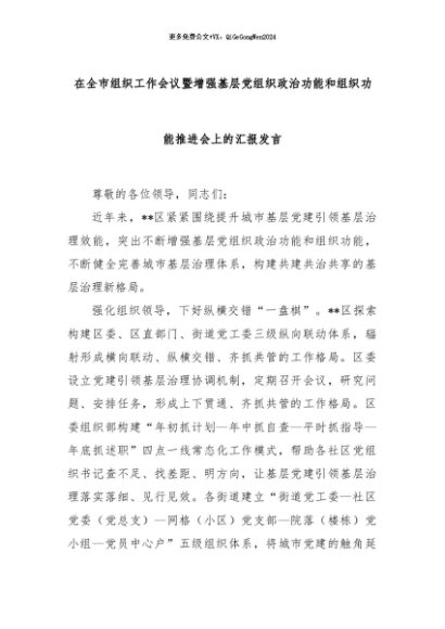 【七哥公文】2024年:在全市组织工作会议暨增强基层党组织政治功能和组织功能推进会上的汇报发言+更多免费公文+VX:QiGeGongWen2024