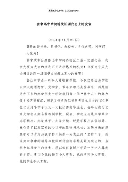 / 【七哥公文】2024年:在鲁迅中学柯桥校区团代会上的发言+更多免费公文+VX:QiGeGongWen2024