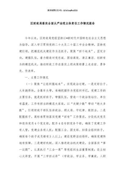 / 【七哥公文】2024年:区财政局落实全面从严治党主体责任工作情况报告+更多免费公文+VX:QiGeGongWen2024