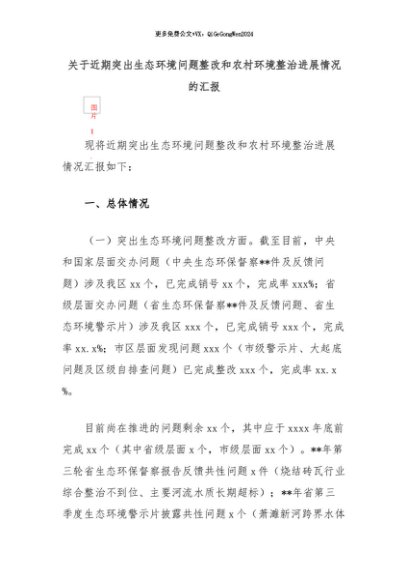 【七哥公文】2024年:关于近期突出生态环境问题整改和农村环境整治进展情况的汇报+更多免费公文+VX:QiGeGongWen2024
