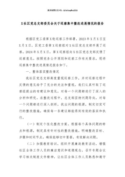 【七哥公文】2024年:X社区党总支部委员会关于巡察集中整改进展情况的报告+更多免费公文+VX:QiGeGongWen2024