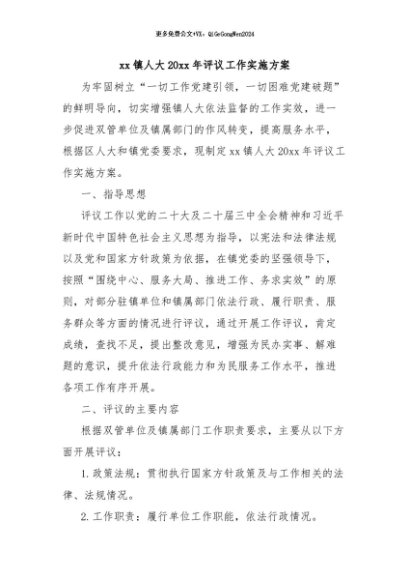 【七哥公文】2024年:xx镇人大20xx年评议工作实施方案+更多免费公文+VX:QiGeGongWen2024