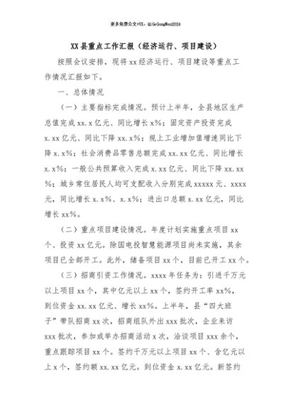 【七哥公文】2024年:XX县重点工作汇报(经济运行、项目建设)+更多免费公文+VX:QiGeGongWen2024