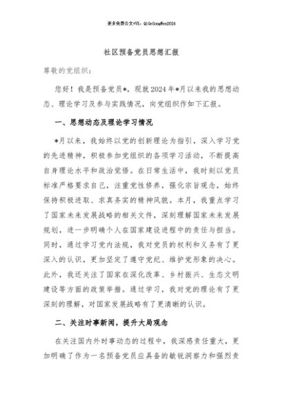 / 【七哥公文】2024年:社区预备党员思想汇报+更多免费公文+VX:QiGeGongWen2024