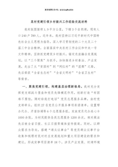 / 【七哥公文】2024年:某村党建引领乡村振兴工作经验交流材料+更多免费公文+VX:QiGeGongWen2024