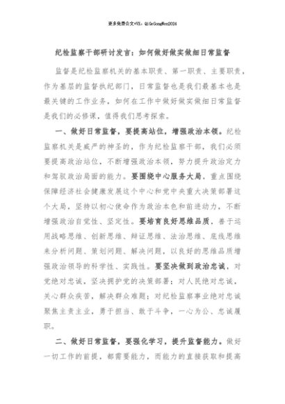 / 【七哥公文】2024年:纪检监察干部研讨发言:如何做好做实做细日常监督+更多免费公文+VX:QiGeGongWen2024