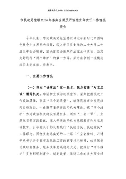 【七哥公文】2024年:市民政局党组2024年落实全面从严治党主体责任工作情况报告+更多免费公文+VX:QiGeGongWen2024