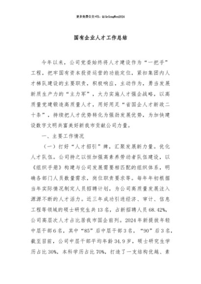 / 【七哥公文】2024年:国有企业人才工作总结+更多免费公文+VX:QiGeGongWen2024