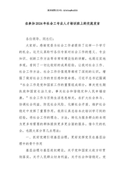 / 【七哥公文】2024年:在参加2024年社会工专业人才培训班上的交流发言+更多免费公文+VX:QiGeGongWen2024