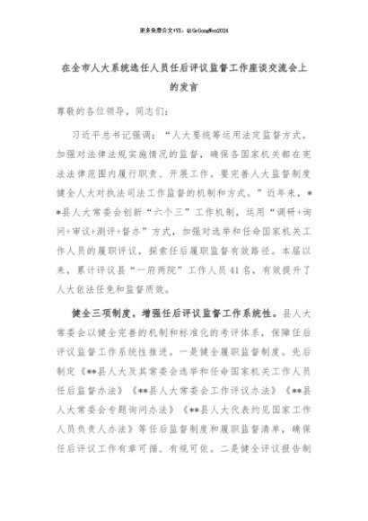 【七哥公文】2024年:在全市人大系统选任人员任后评议监督工作座谈交流会上的发言+更多免费公文+VX:QiGeGongWen2024