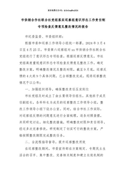 【七哥公文】2024年:市供销合作社联合社党组落实巡察组意识形态工作责任制专项检查反馈意见整改情况的报告+更多免费公文+VX:QiGeGongWen2024
