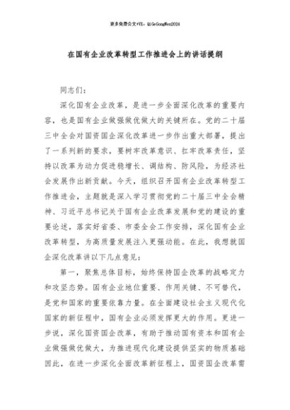 / 【七哥公文】2024年:在国有企业改革转型工作推进会上的讲话提纲+更多免费公文+VX:QiGeGongWen2024