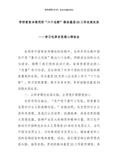 【七哥公文】2024年:学好看家本领用好“六个论断”推动基层XX工作走深走实——学习毛泽东思想心得体会+更多免费公文+VX:QiGeGongWen2024