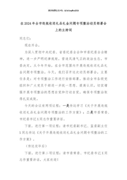 【七哥公文】2024年:在2024年全市违规收送礼品礼金问题专项整治动员部署会上的主持词+更多免费公文+VX:QiGeGongWen2024