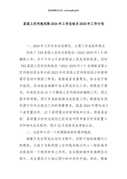 【七哥公文】2024年:县国土空间规划股2024年工作总结及2025年工作计划+更多免费公文+VX:QiGeGongWen2024