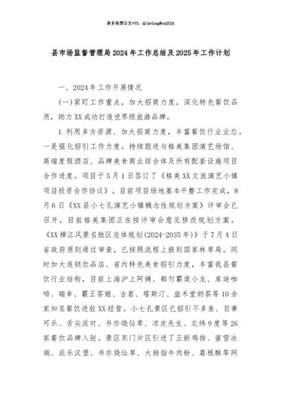 【七哥公文】2024年:县市场监督管理局2024年工作总结及2025年工作计划+更多免费公文+VX:QiGeGongWen2024