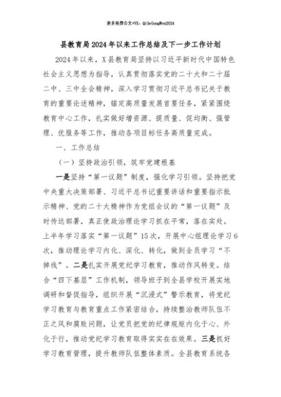 / 【七哥公文】2024年:县教育局2024年以来工作总结及下一步工作计划+更多免费公文+VX:QiGeGongWen2024