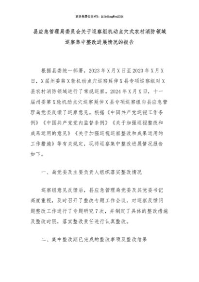 【七哥公文】2024年:县应急管理局委员会关于巡察组机动点穴式农村消防领域巡察集中整改进展情况的报告+更多免费公文+VX:QiGeGongWen2024