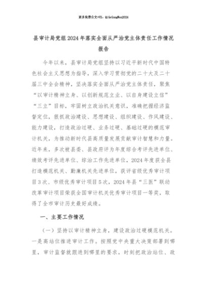 【七哥公文】2024年:县审计局党组2024年落实全面从严治党主体责任工作情况报告+更多免费公文+VX:QiGeGongWen2024