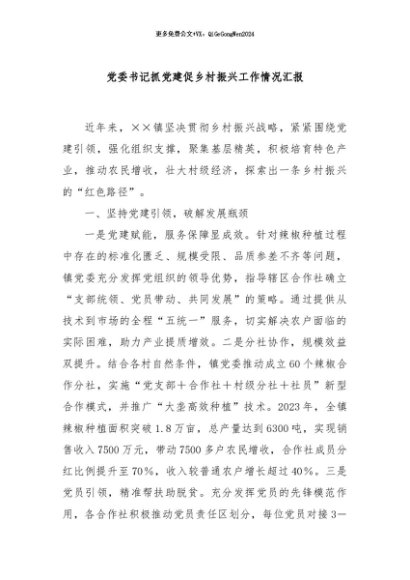 / 【七哥公文】2024年:党委书记抓党建促乡村振兴工作情况汇报+更多免费公文+VX:QiGeGongWen2024