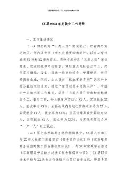 / 【七哥公文】2024年:XX县2024年度就业工作总结+更多免费公文+VX:QiGeGongWen2024