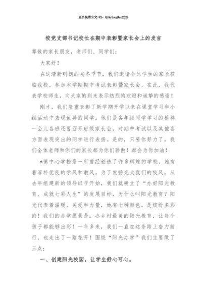 / 【七哥公文】2024年:校党支部书记校长在期中表彰暨家长会上的发言+更多免费公文+VX:QiGeGongWen2024