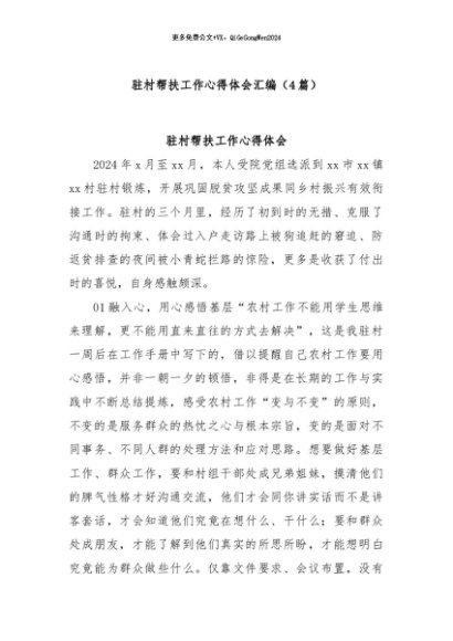 / 【七哥公文】2024年:(4篇)驻村帮扶工作心得体会汇编+更多免费公文+VX:QiGeGongWen2024