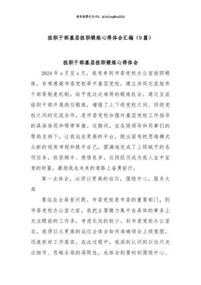 / 【七哥公文】2024年:(9篇)挂职干部基层挂职锻炼心得体会汇编+更多免费公文+VX:QiGeGongWen2024