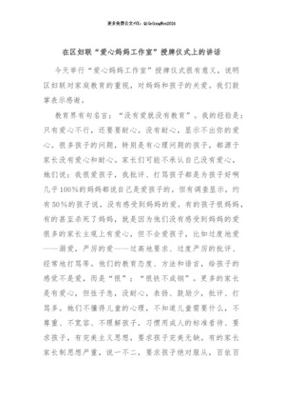 / 【七哥公文】2024年:在区妇联“爱心妈妈工作室”授牌仪式上的讲话+更多免费公文+VX:QiGeGongWen2024