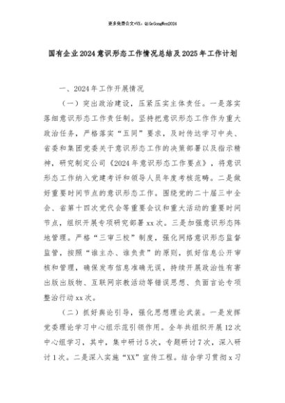 【七哥公文】2024年:国有企业2024意识形态工作情况总结及2025年工作计划+更多免费公文+VX:QiGeGongWen2024