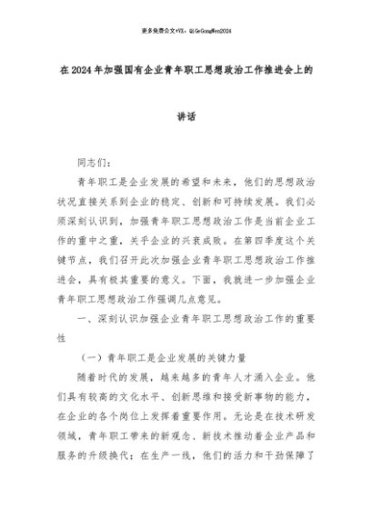 【七哥公文】2024年:在2024年加强国有企业青年职工思想政治工作推进会上的讲话+更多免费公文+VX:QiGeGongWen2024