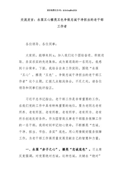 【七哥公文】2024年:交流发言:永葆五心擦亮五色争做忠诚干净担当的老干部工作者+更多免费公文+VX:QiGeGongWen2024