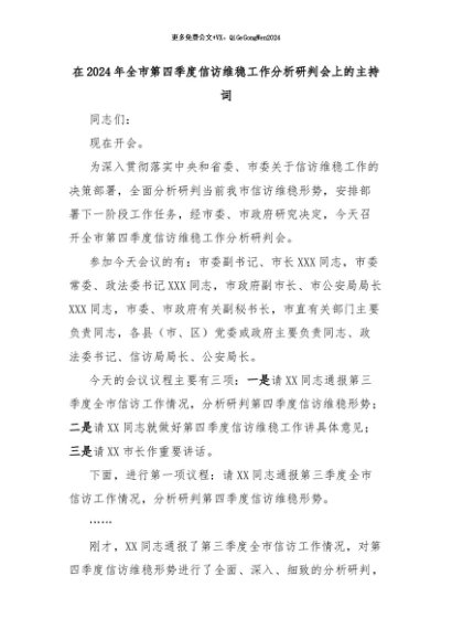 【七哥公文】2024年:在2024年全市第四季度信访维稳工作分析研判会上的主持词+更多免费公文+VX:QiGeGongWen2024