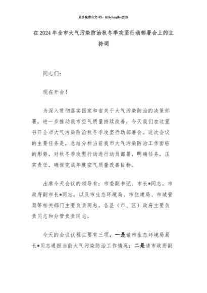 【七哥公文】2024年:在2024年全市大气污染防治秋冬季攻坚行动部署会上的主持词+更多免费公文+VX:QiGeGongWen2024