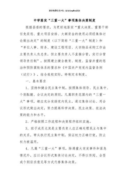 / 【七哥公文】2024年:中学落实“三重一大”事项集体决策制度+更多免费公文+VX:QiGeGongWen2024